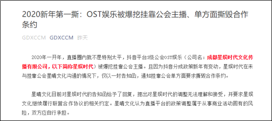 1月16日,微信公众号「GDXCCM」发了推文《2020新年第一撕:OST娱乐被爆挖挂靠公会主播、单方面撕毁合作条约》,爆料双方纠纷的导火索是抖音公会分成政策调整,OST娱乐在未与挂靠公会星晴文化沟通前提下,以一封告知函通知挂靠公会单方面要求撕毁合作条约。