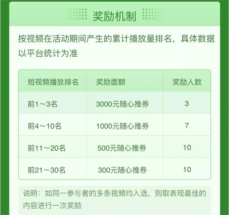 据悉,数据表现优异的短视频,有机会获得平台最高3000元随心推奖励。奖励机制按视频在活动期间产生的累计播放量排名,具体数据以平台统计为准。