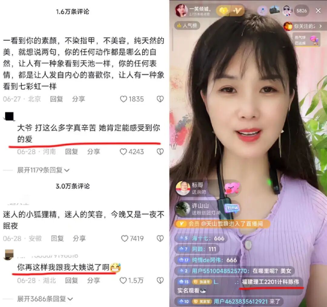 在评论区表白,在直播间打赏,再和“@秀才”合拍视频,俨然成为阿姨们的流行风尚。