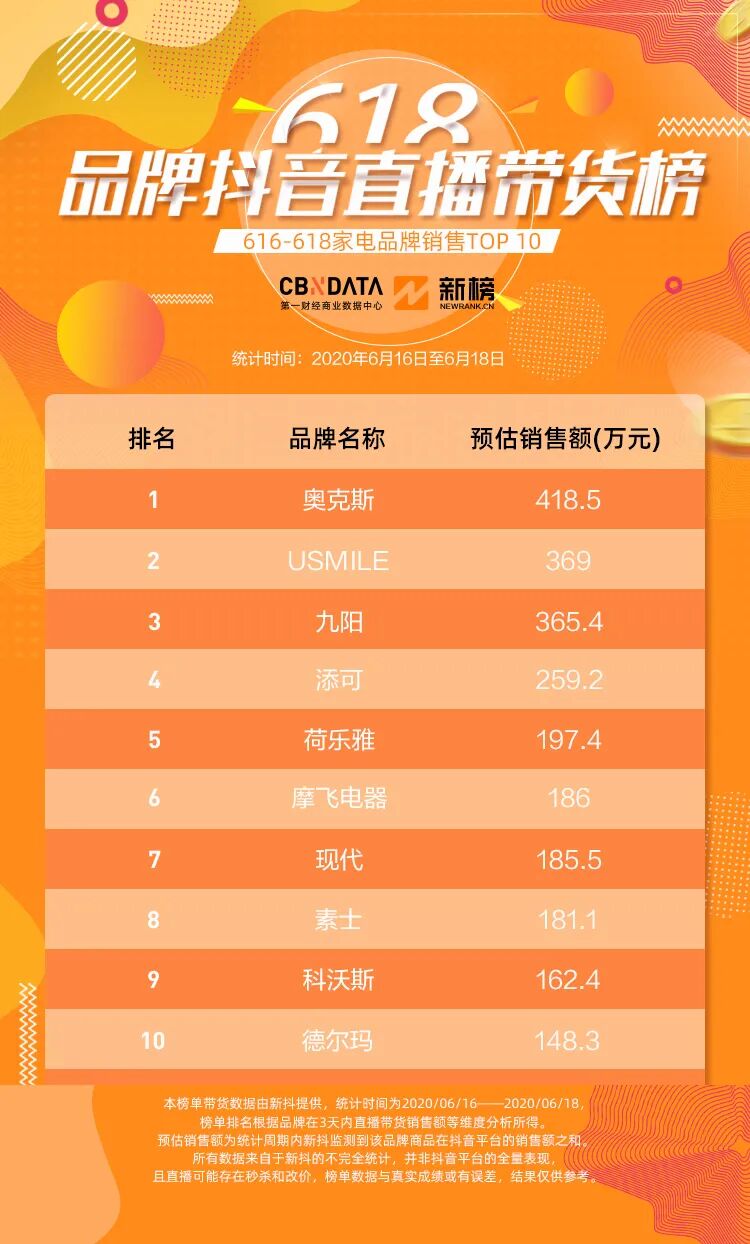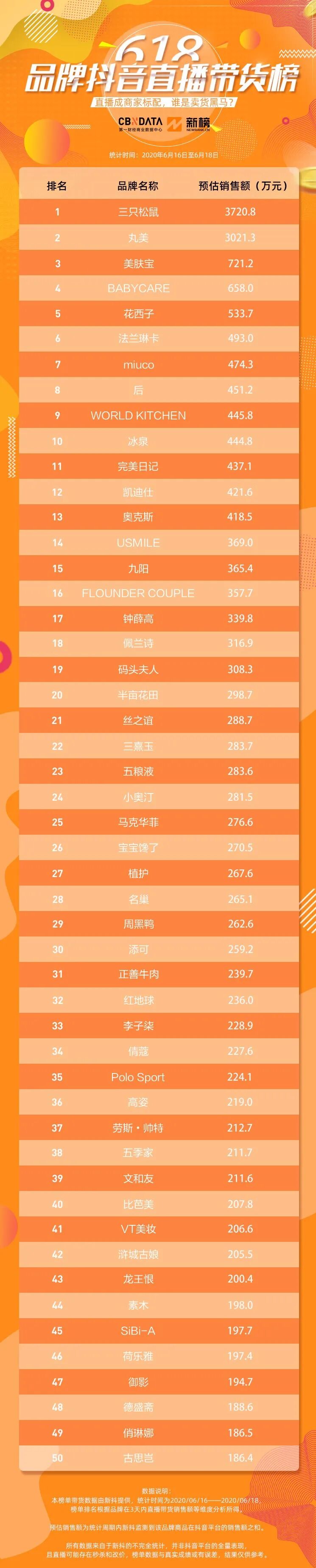 数据说明:本榜单带货数据由新抖提供,统计时间为2020/06/16——2020/06/18,榜单排名根据品牌在3天内直播带货销售额等维度分析所得。