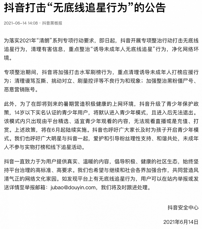 新榜讯 6月14日,抖音在其官方头条号发布公告称,为落实2021年“清朗”系列专项行动要求,即日起,抖音开展专项整治行动打击无底线追星行为,清理有害信息,重点整治“诱导未成年人无底线追星”行为,净化网络环境。