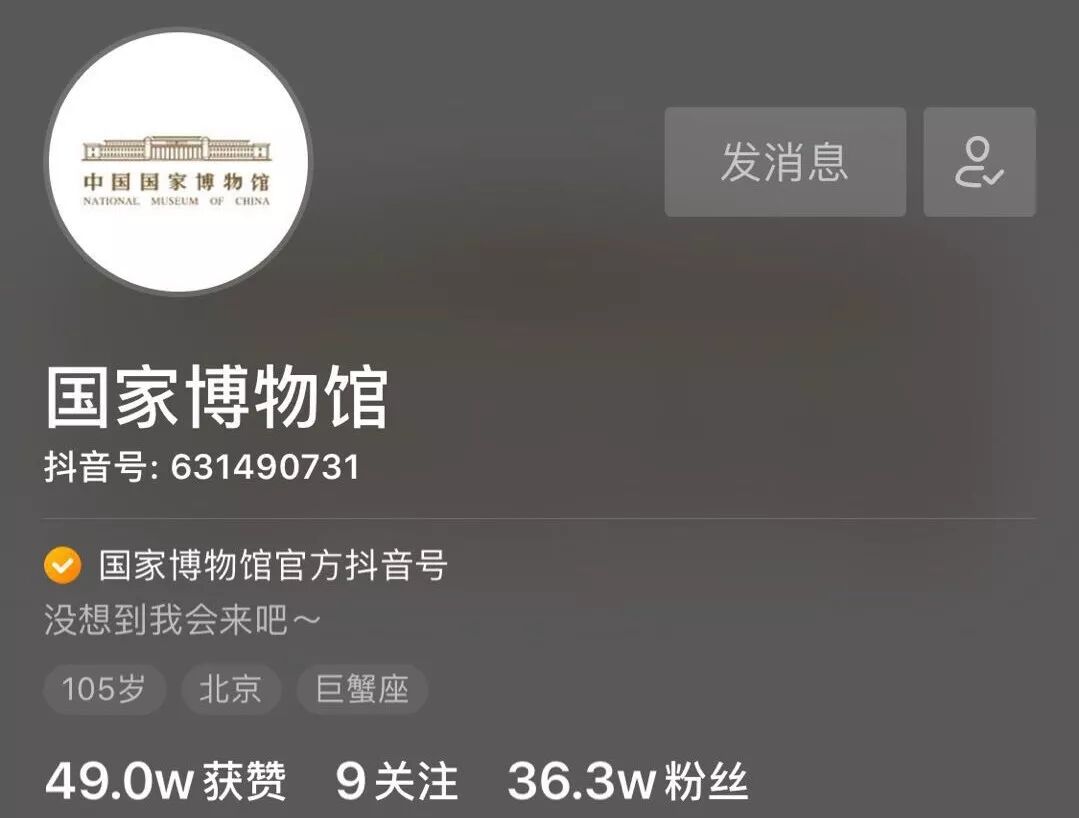 比如,国家博物院的抖音号个人介绍是:105岁,北京,巨蟹座,个性签名还调侃道“没想到我会来吧~”