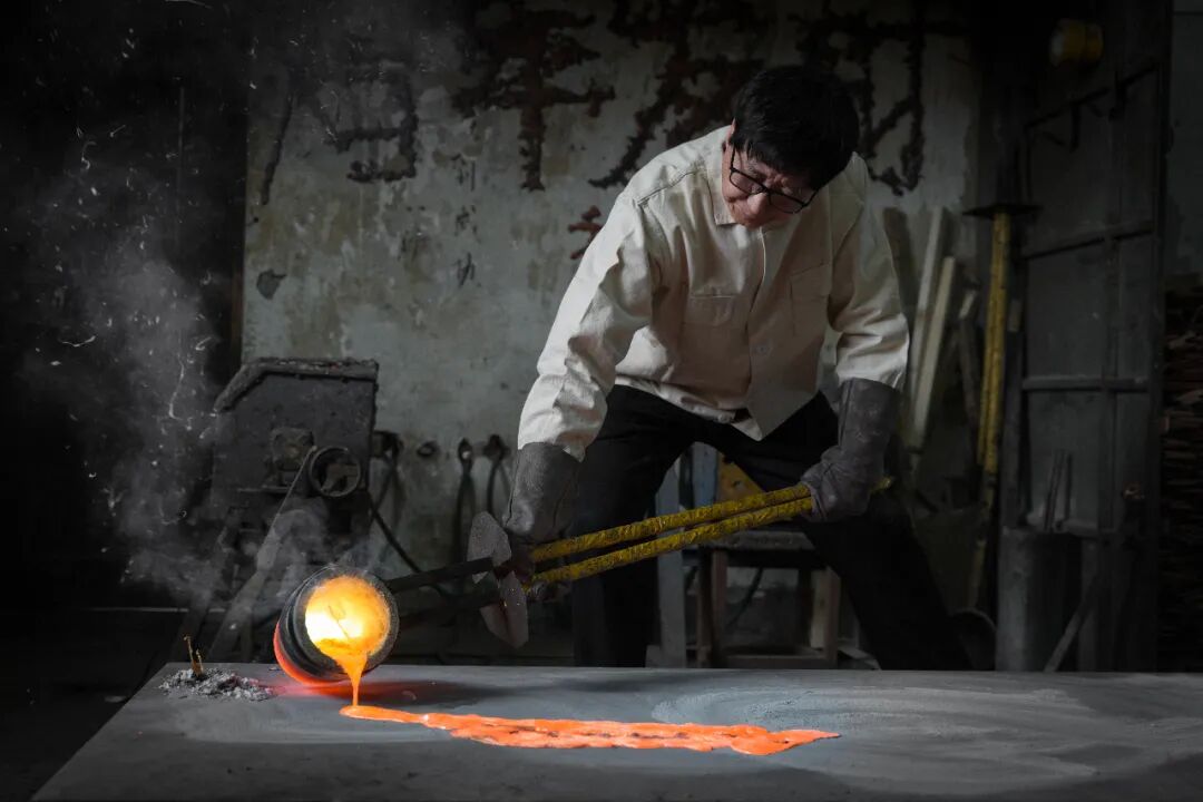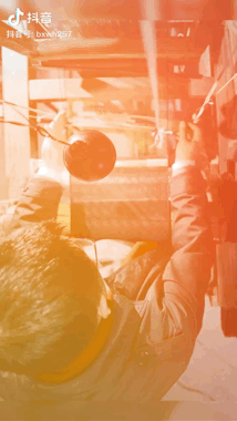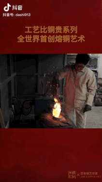 在朱炳仁的抖音号@铜雕大师朱炳仁,能看到熔铜的制作过程,红彤彤的铜水浇灌在各种介质中,自由流淌,最后凝固落定。