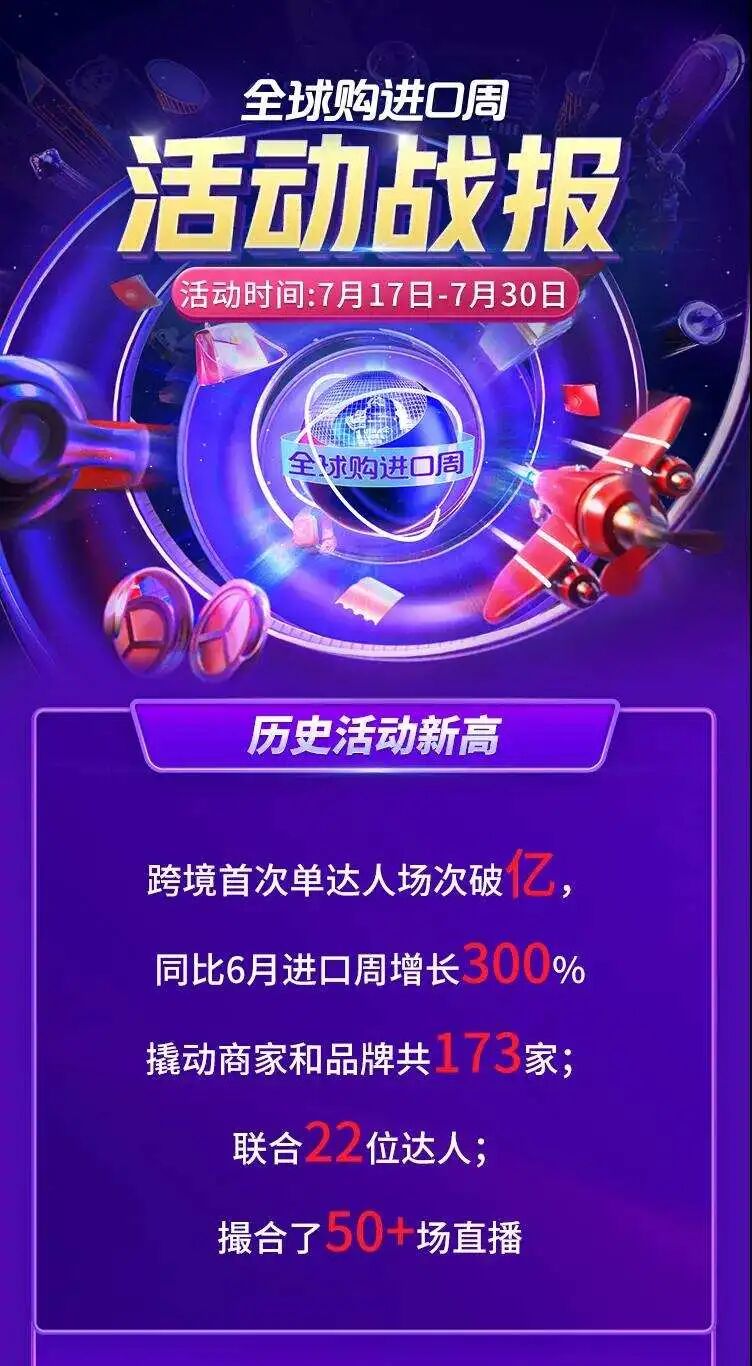 据悉,此次活动共吸引173家品牌和商家参与,联合22位达人,打造50+场直播。活动期间,#全球购进口周、#全球寻宝猎人话题曝光量1.2亿+。