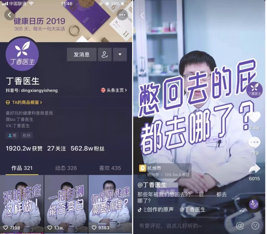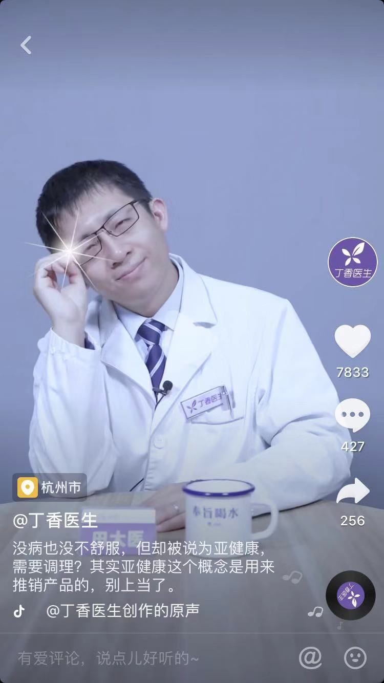 田太医:目前视频方面我们主要在抖音和B站上做,B站已经做了两个月,现在也是处于摸索期。在抖音上我们只有丁香医生这一个号,然后是把丁香医生的成功经验通过培训赋能给丁香妈妈——丁香医生和丁香妈妈是各自独立的两个团队。