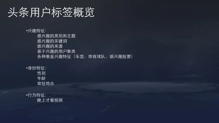 在一篇今日头条算法架构师曹欢欢发布的《今日头条推荐算法原理》的PPT里,算法被分为三个维度:内容特性、用户特征、环境特征。