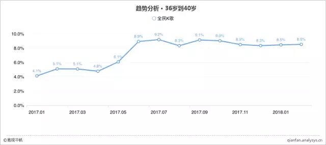 比起快手和抖音,全民K歌的用户更平民化。据易观千帆数据,全民K歌24岁以下用户从2017年的72%,下降到如今的54%。同时中年人的黏性更强,有空闲的70后们开始贡献在线时长和用户粘性。