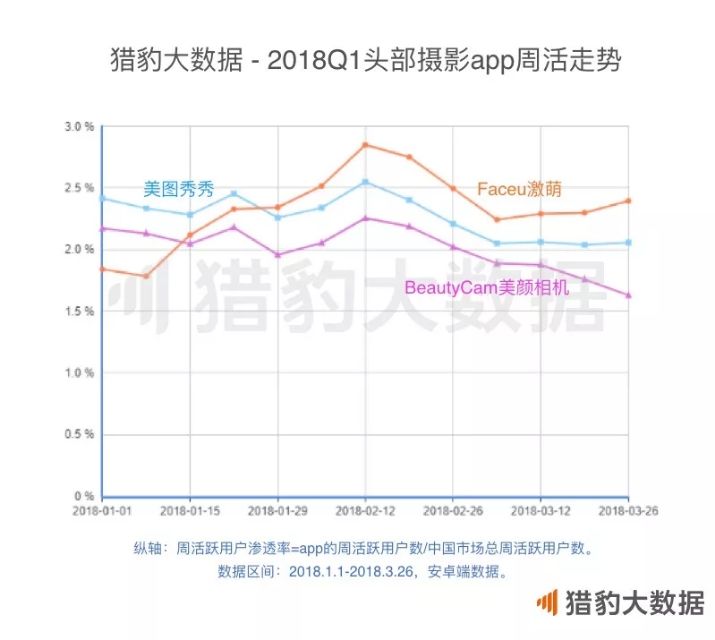 猎豹大数据显示,第一季度短视频的火爆带动了摄影App的增长。有今日头条加持,Faceu激萌的周活已经超过了美图秀秀和美颜相机。前不久被天鸽互动收购的无他相机,也成为一匹黑马。