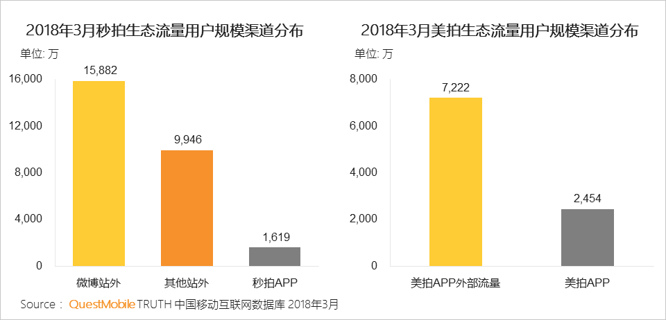 很明显,短视频正在切割即时通讯时长,难怪腾讯急了。不过再往下看第二个数据,2018年3月,秒拍和美拍App的外部流量远超站内流量,差距在3倍、甚至10倍以上。