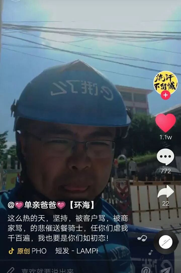 刚开始的时候,我们为外卖小哥点赞,说他们多辛苦多辛苦,后来开始有视频说:“难道我们就不辛苦吗?被老板骂,改方案到两点多没吃饭,他迟到半小时,现在快四点了我吃午饭,我的人生不辛苦吗?”