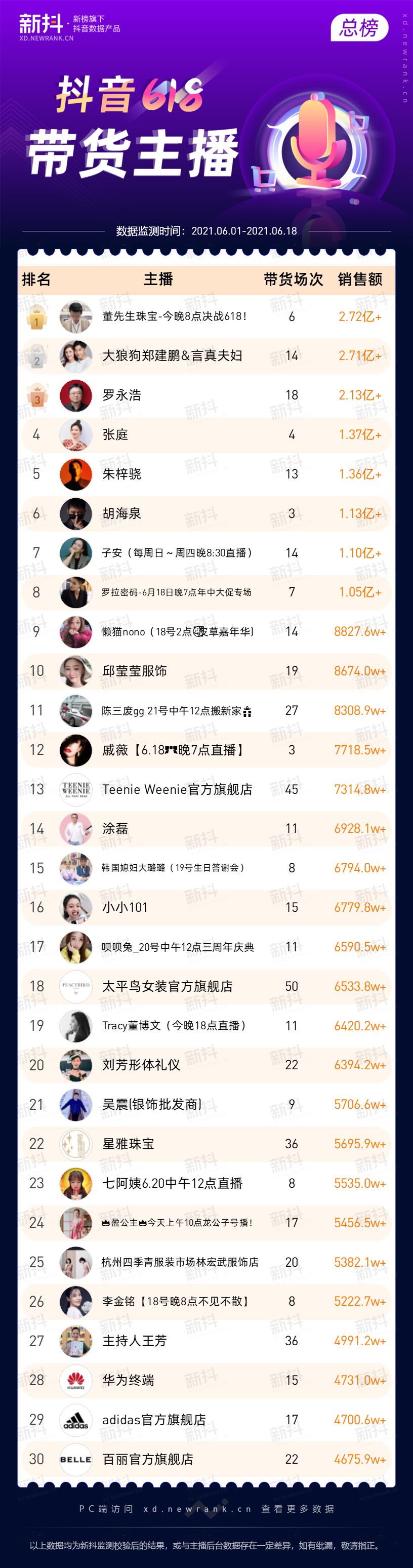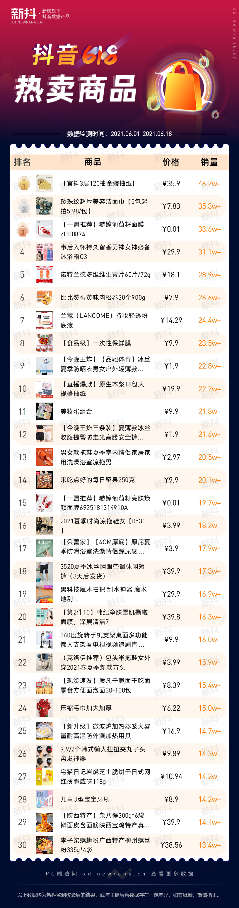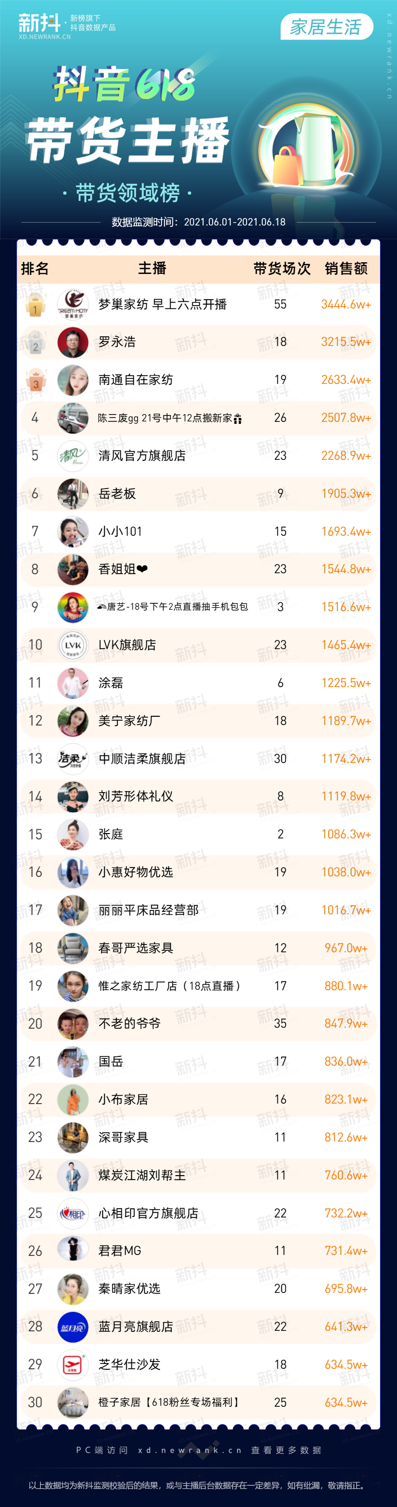数据说明:所有榜单带货数据均由新抖提供,监测范围为6月1日-6月18日期间开播的直播间。