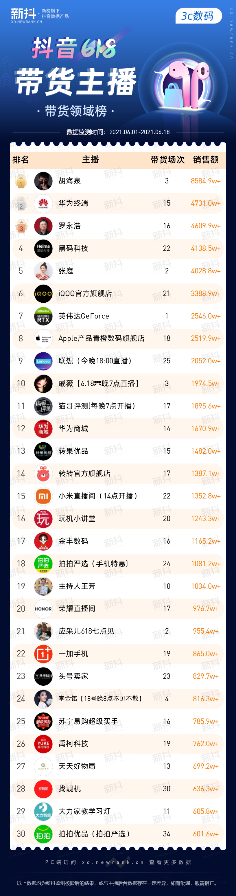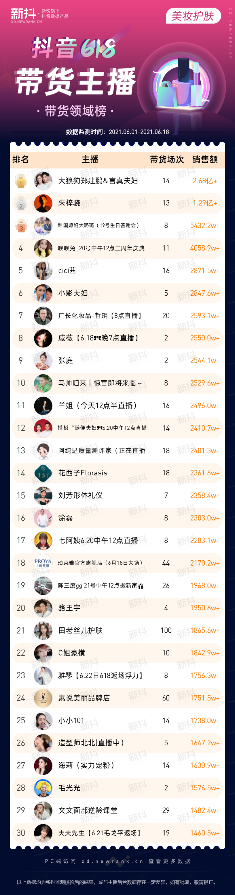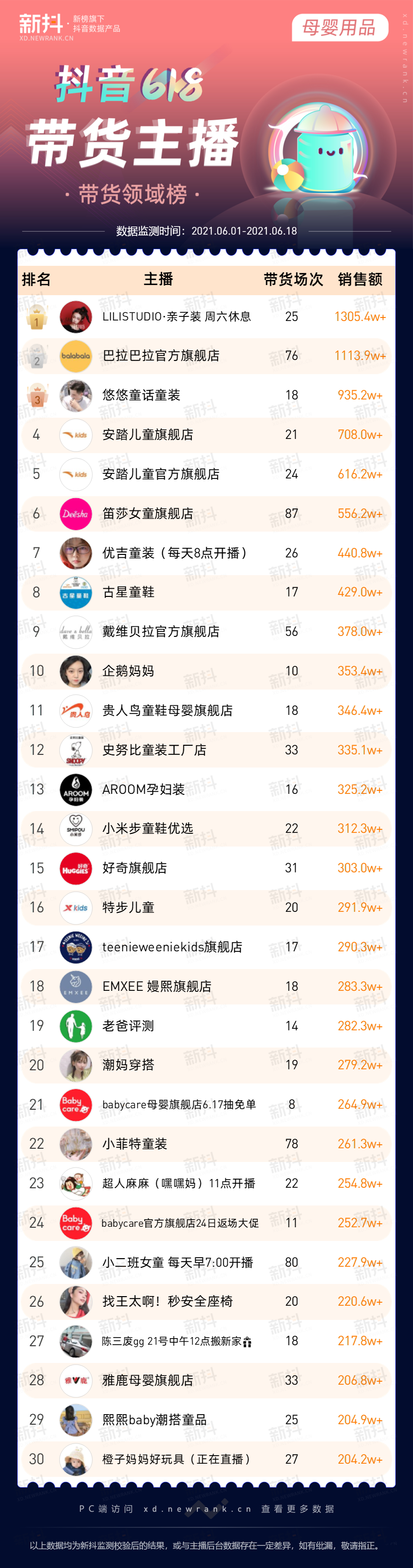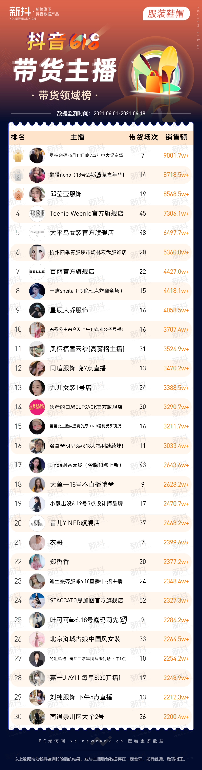 数据说明:所有榜单带货数据均由新抖提供,监测范围为6月1日-6月18日期间开播的直播间。