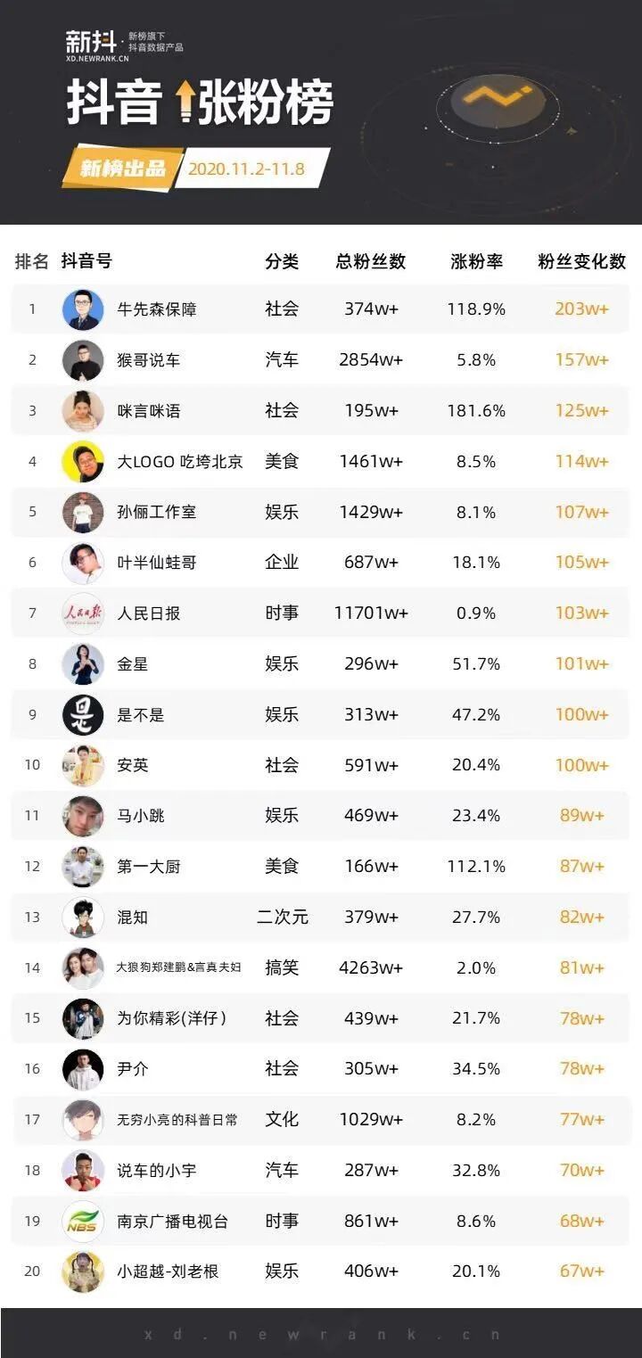 ps. 以下是本期抖音红人涨粉榜单,如果觉得不够看,请登录新榜旗下抖音全场景AI数据平台“新抖”(xd.newrank.cn)查看各分类抖音榜单!