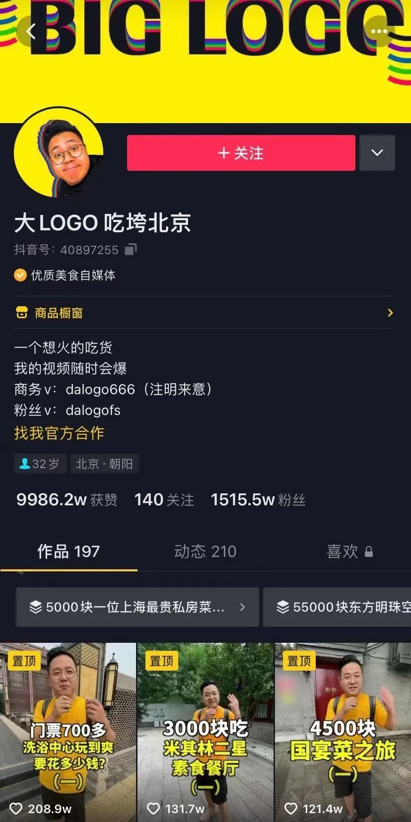 账号名看上去也像在放狠话,叫“大LOGO吃垮北京”,目前抖音粉丝数1515万。而实际上除了北京,全国各地都有他探店打卡的身影。