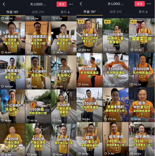 在这一次次价格不菲却新奇的体验下,据新榜旗下抖音数据平台“新抖”显示,“大LOGO吃垮北京”在一个月内涨粉近500万,平均每条视频点赞达70万。
