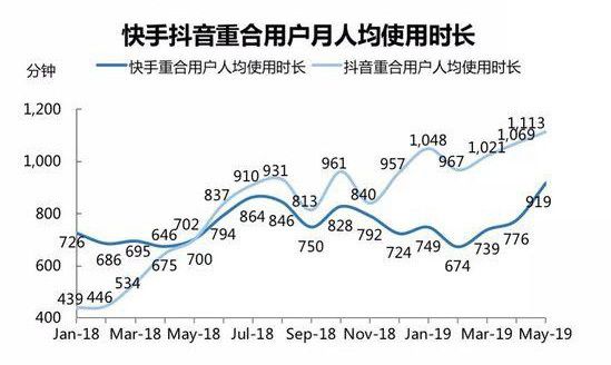 智氪研究院的数据显示,2019年5月快手和抖音的用户重合度达到了46.5%,在2018年一数字仅为18.7%。此外,两个平台的大V也深度重合。快手高级副总裁马宏斌曾透露,快手前100名的大V有70个是抖音用户,抖音前100名的大V有50个是快手用户。不过,在人均使用时长上,抖音要高于快手。