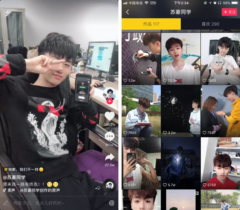 “苏豪同学”曾借跳一跳的东风,精准配合音乐和画面,打造了一条播放量破亿的超级爆款,新增粉丝20万,其长尾效应甚至长达几个月,很大程度上得益于“会做特效的清新校草”人设。