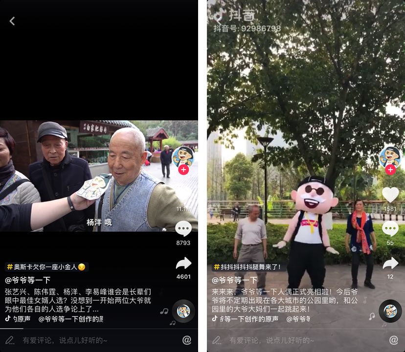 比如“爷爷等一下”,这个账号在用年轻人的方式讲述老年人的故事,看起来很不“抖音”,但视频线中稳定的拍摄对象和拍摄群体,以及年轻化的拍摄方式反而形成很“抖音”的特色。